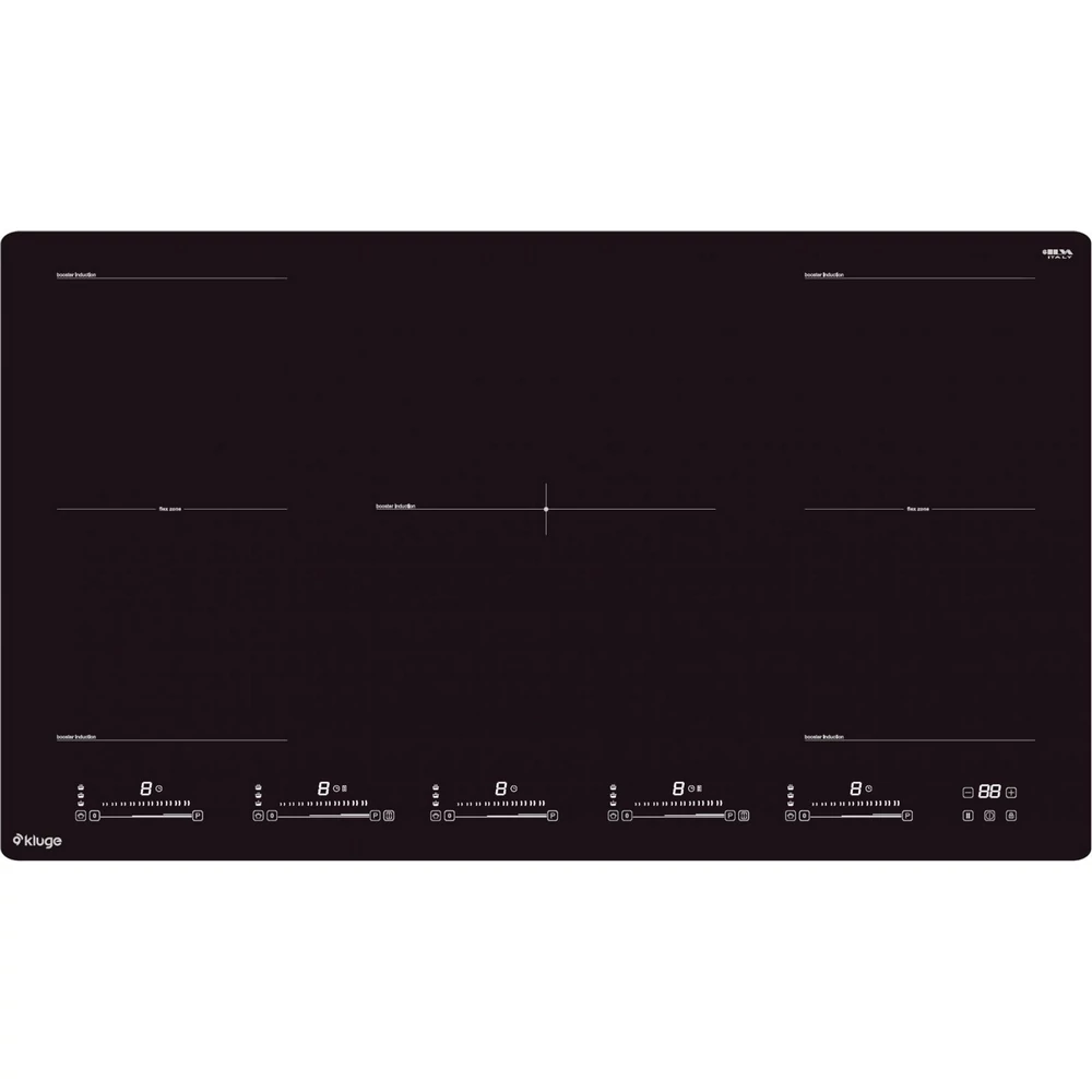 - 5 főzőzóna: bal első 190×190 mm (1,5/1,8/2,0 kW), jobb első 190×190 mm (1,5/1,8/2,0 kW), bal hátsó 190×190 mm (2,0/2,4/2,8 kW), jobb hátsó 190×190 mm (2,0/2,4/2,8 kW), középső 280 mm (2,3/3,0/3,3 kW)